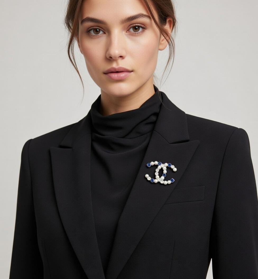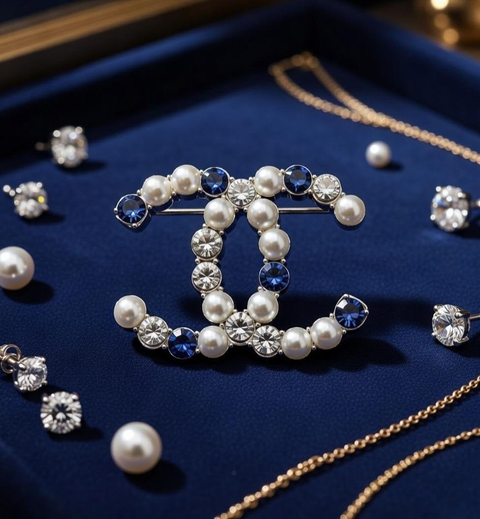 Soyez le premier à laisser votre avis sur “Broche Chanel CC Iconique – Perles Nacré & Cristaux Bleus Saphir, Strass Scintillants, Métal Doré”
