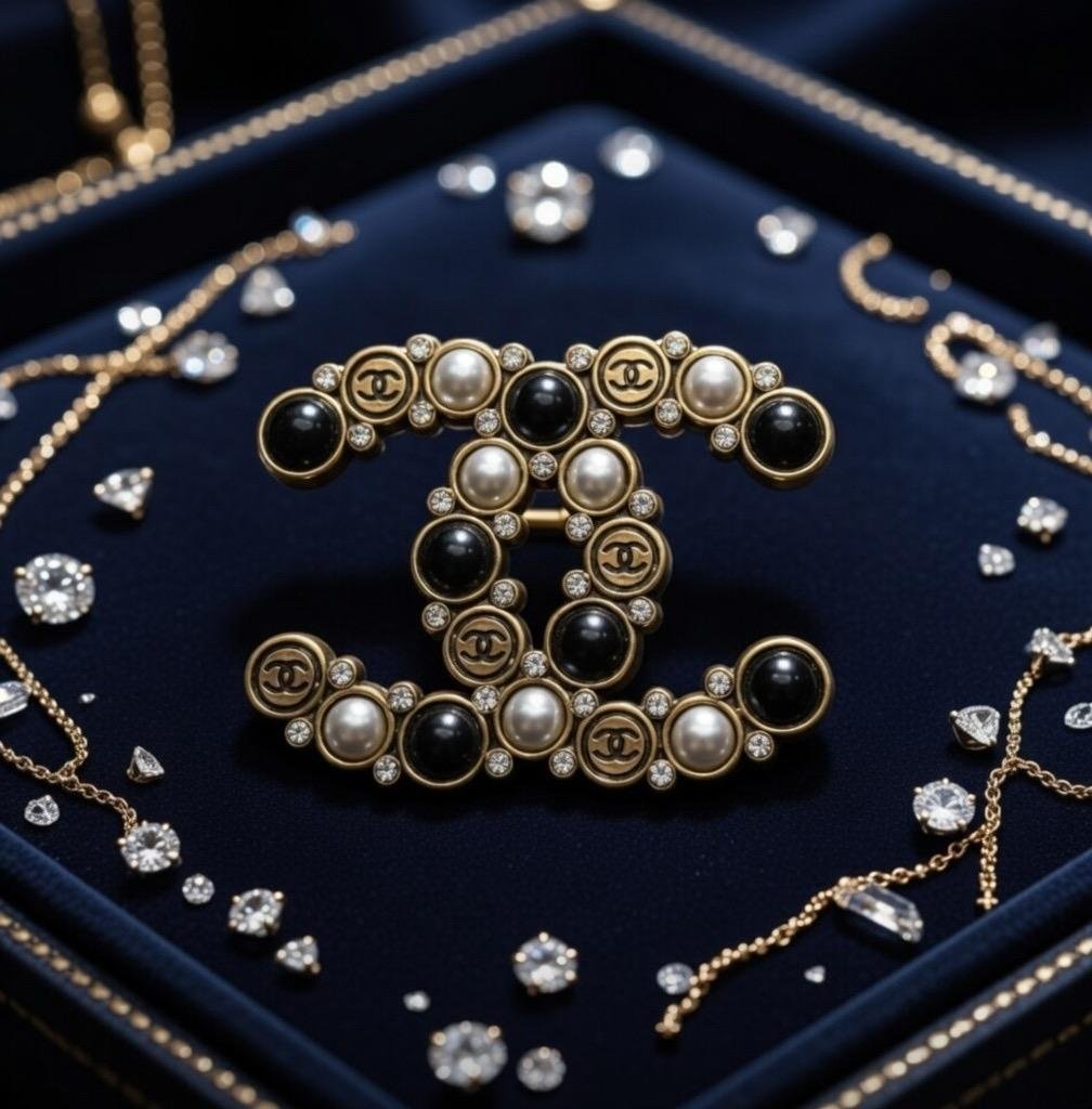 2 avis pour Broche Chanel CC Iconique – Perles Noires & Blanches, Strass & Métal Doré